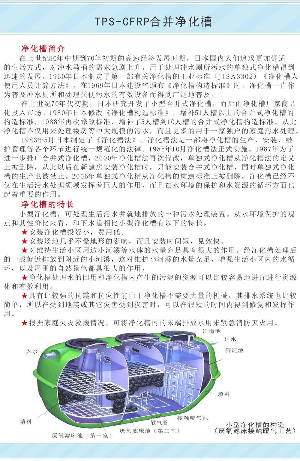 小(xiǎo)型淨化槽,可處理(lǐ)生活污水(shuǐ)并就地排放(fàng)的一種污水(shuǐ)處理(lǐ)裝置。