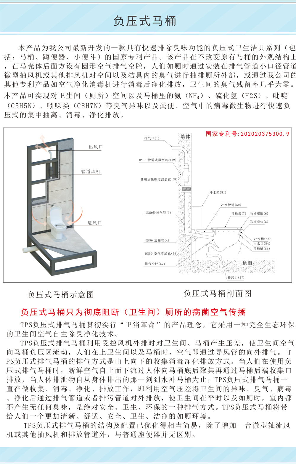 本公司最新開(kāi)發的一款具有快(kuài)速排除臭味功能(néng)的負壓式衛生潔具系列(包括:馬桶、蹲便器、小(xiǎo)便鬥)的國家專利産品。