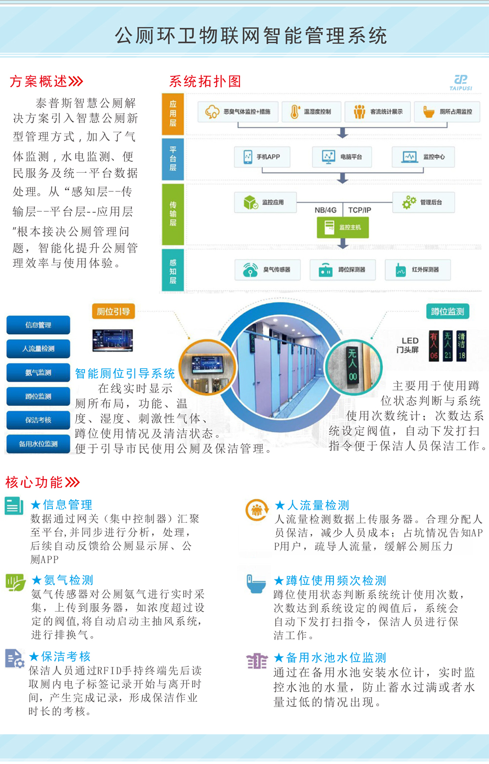 泰普斯智慧公廁解決方案引入智慧公廁新型管理(lǐ)方式,加入了(le)氣體檢測、水(shuǐ)電檢測、便民服務及統一平台數據處理(lǐ)。從(cóng)“感知(zhī)層——傳輸層——平台層——應用(yòng)層”根本解決公廁管理(lǐ)問題,智能(néng)化提升公廁管理(lǐ)效率與使用(yòng)體驗。